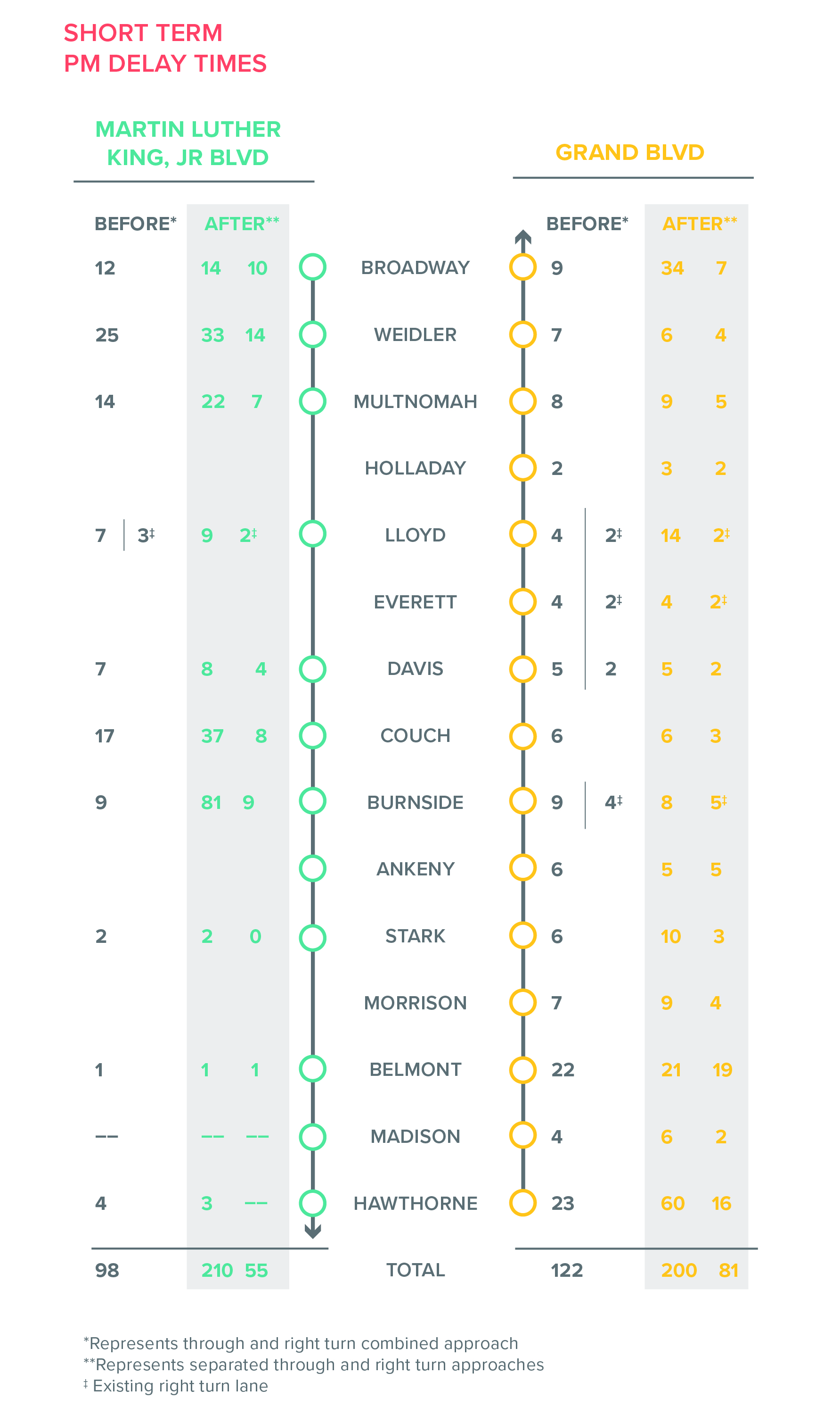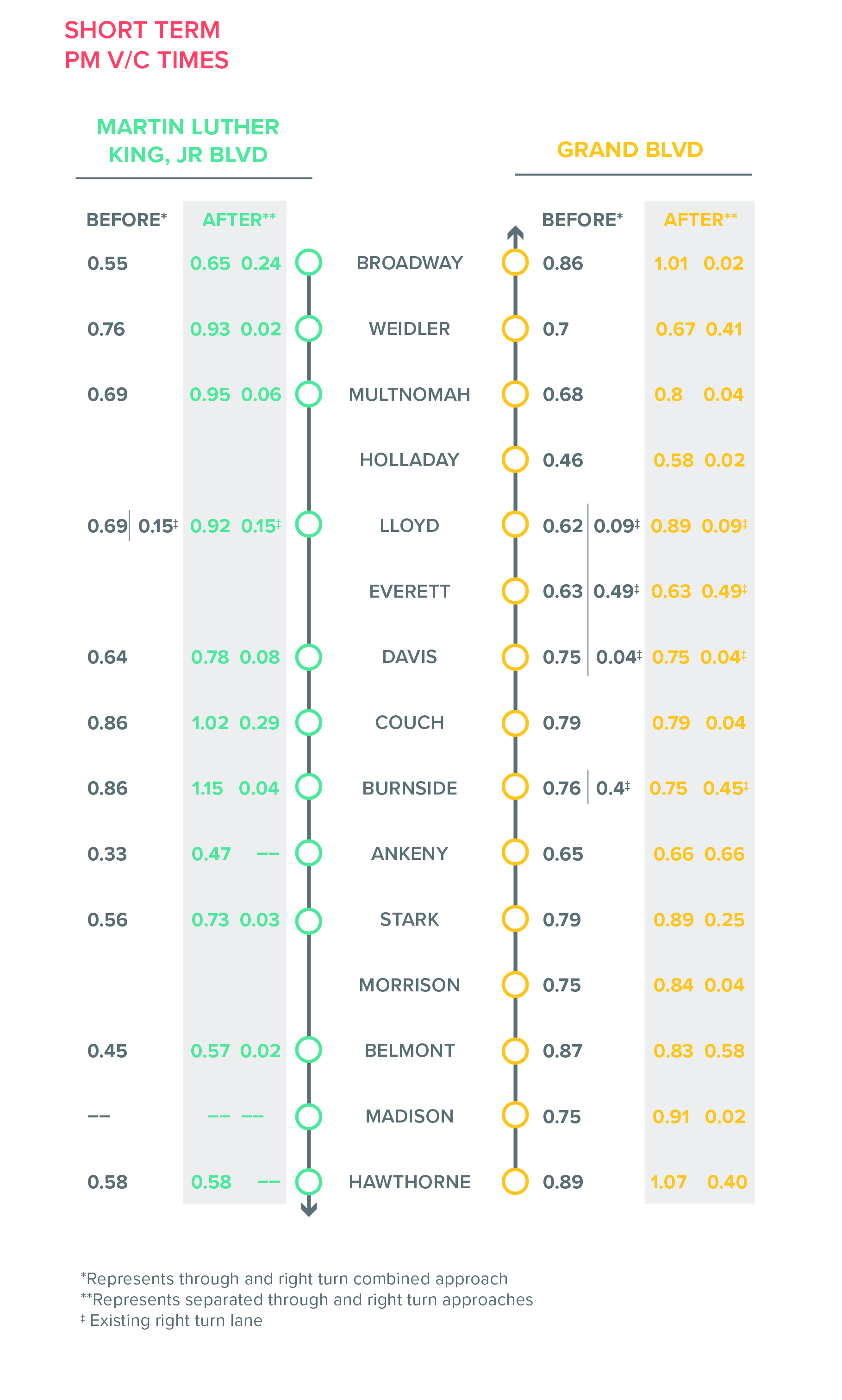 The engineers needed to show the data from the peak hour delay analysis, but wanted a more visual way to show it than an Excel chart. I was tasked with creating a graphic that would work for both delay time and v/c time, before and after changes were implemented along two streets with many intersections.