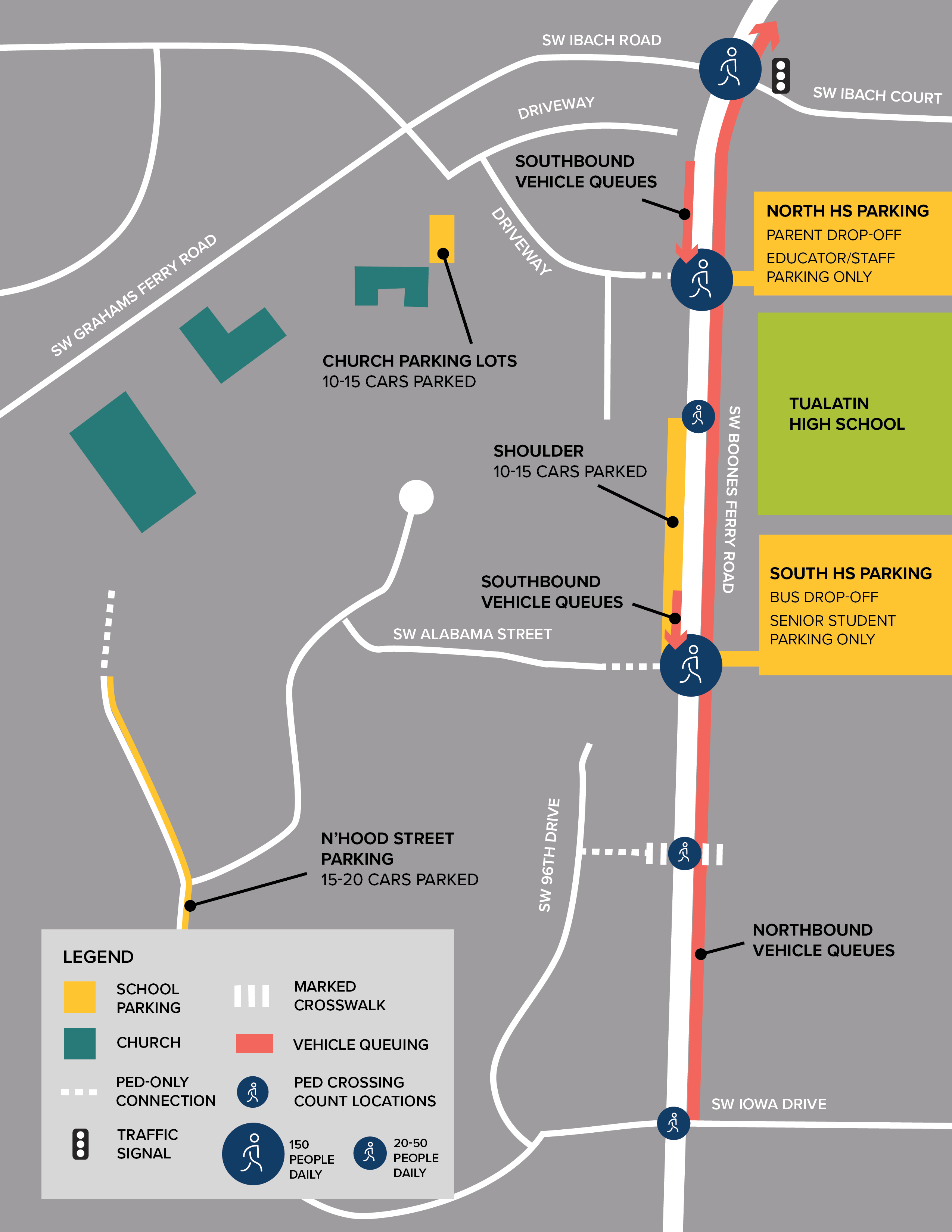 A graphic created for a pedestrian crossing study on Boones Ferry Road. The client wanted to take the data DKS engineers had gathered and show it in a more visual way.